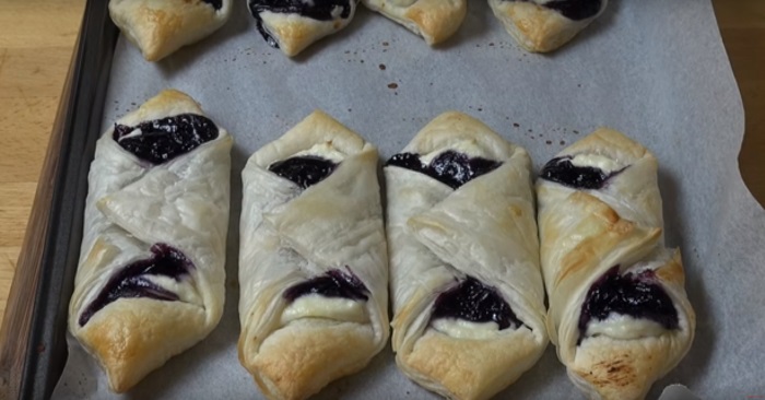 5. Klipp deigen i 8 små ruter. Legg en klatt osteblanding og blåbærsaus på hver rute.