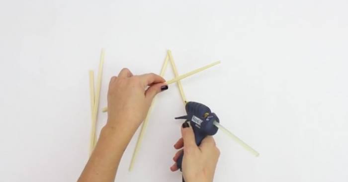 Begynn fra bunnen opp, rad for rad, og lim dekorsteinene sammen. Det er best å holde tritt med en varm limpistol. Dekorsteiner får du i de fleste hobbybutikker.