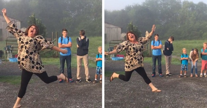Mens hennes fem skolebarn står bak henne og viser flere nyanser av pinlighet. «Mammaaaaa, jeg kan ikke tro at du gjør det der…»
