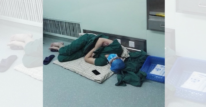 Etter å ha jobbet i 28 timer, legger Luo Heng seg ned på gulvet for å hvile øynene. I løpet av sekunder sovnet han – han rakk ikke engang å ta av seg den kirurgiske masken.