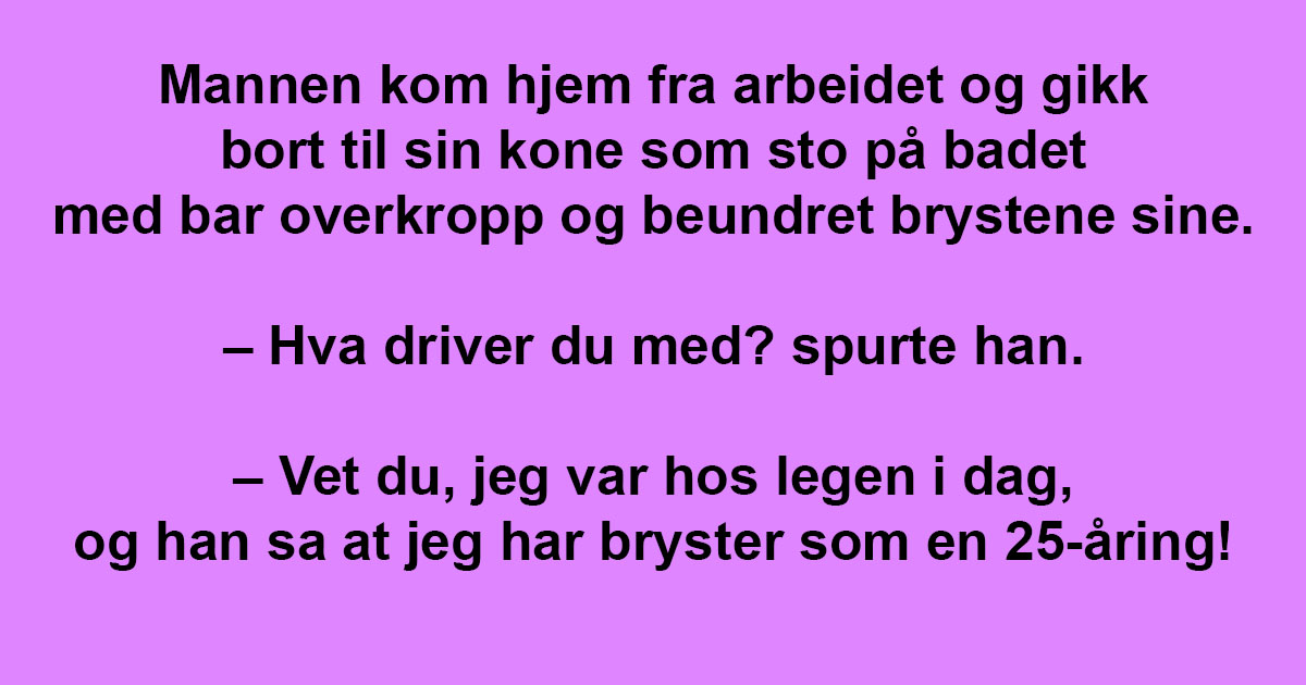 – Vet du, jeg var hos legen i dag, og han sa at jeg har bryster som en 25-åring!